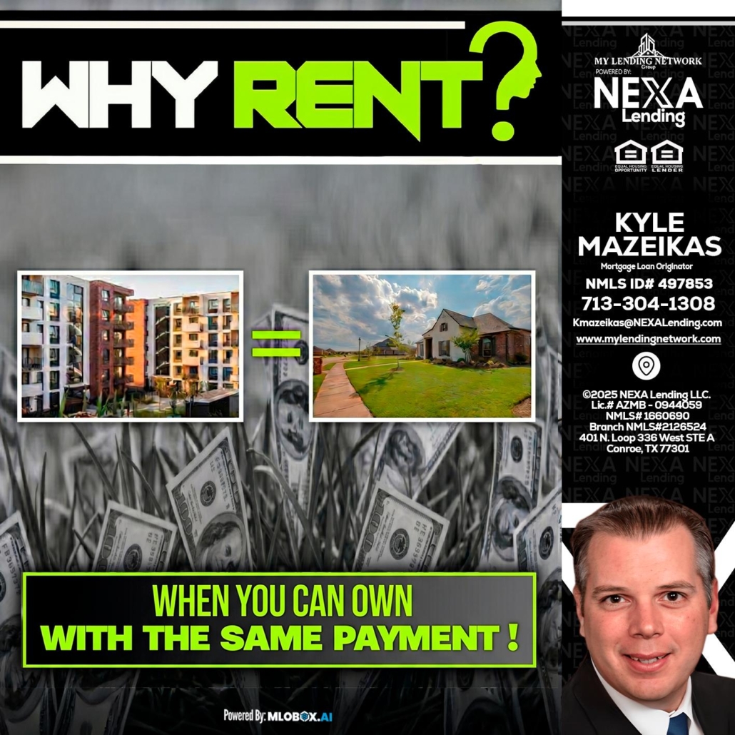 WHY RENT? - Kyle Mazeikas -Branch Manager / Mortgage AdvisorAre you tired of renting? Are you tired of paying someone else’s mortgage but not yours? If Yes, then contact me and we can change that, starting today.